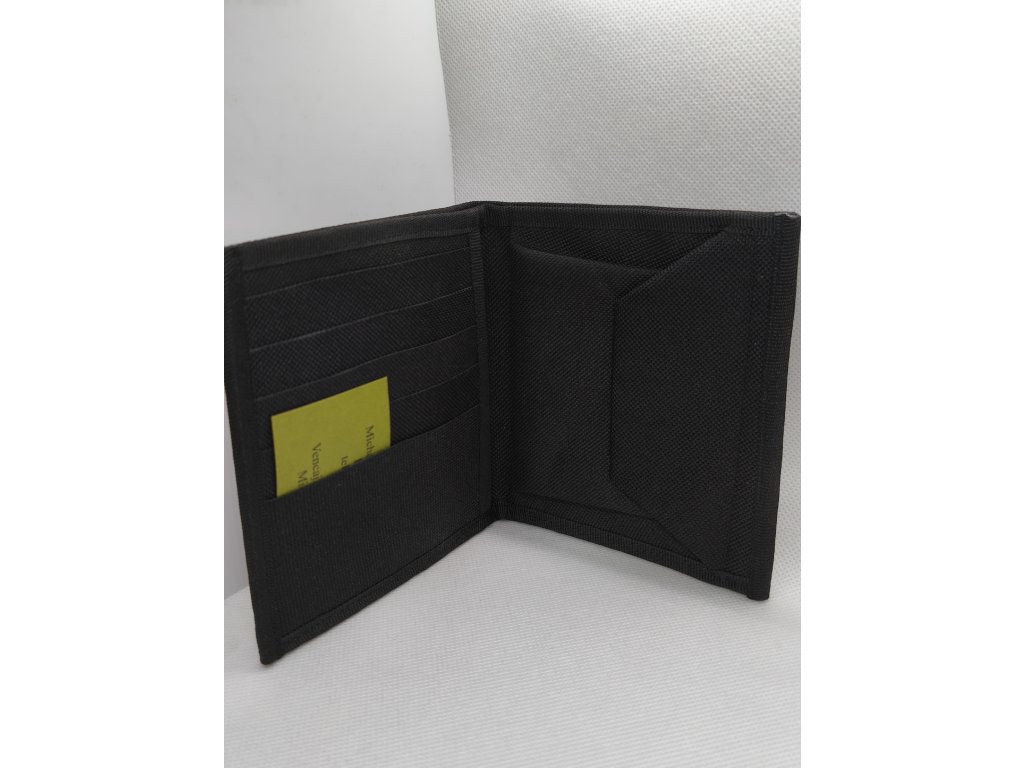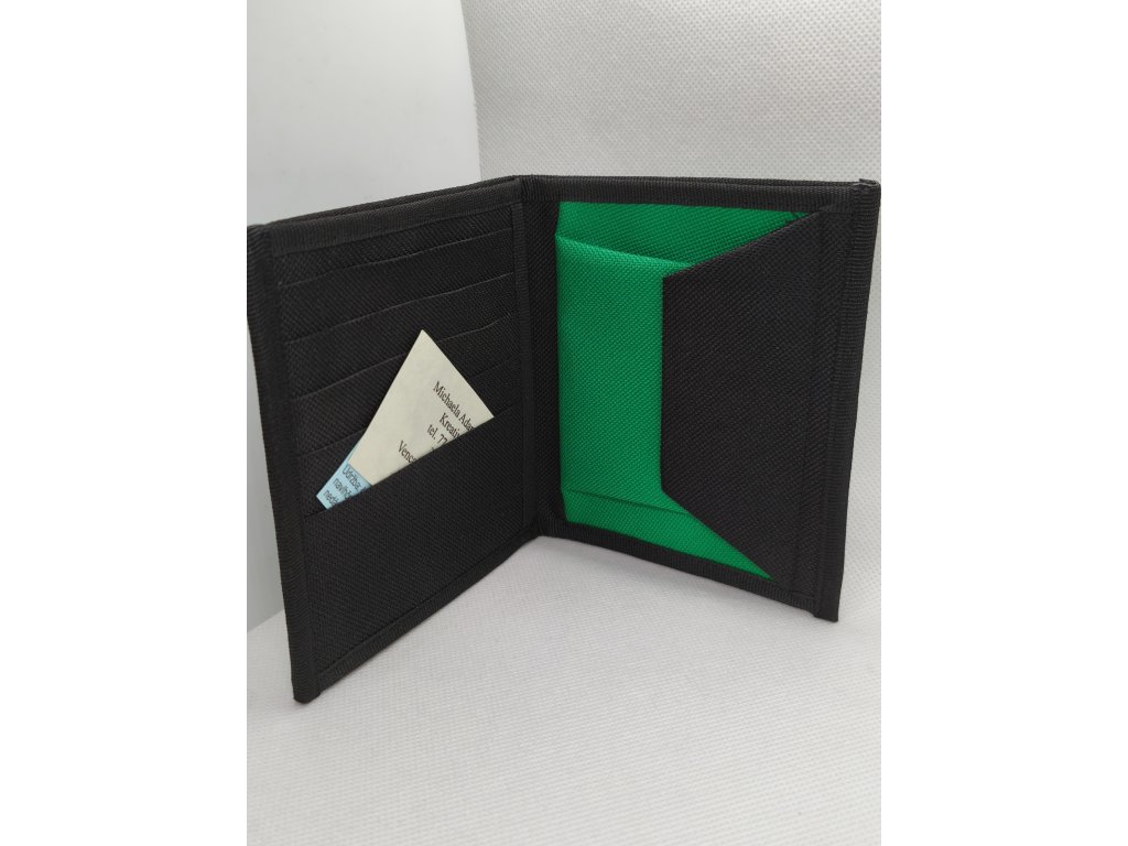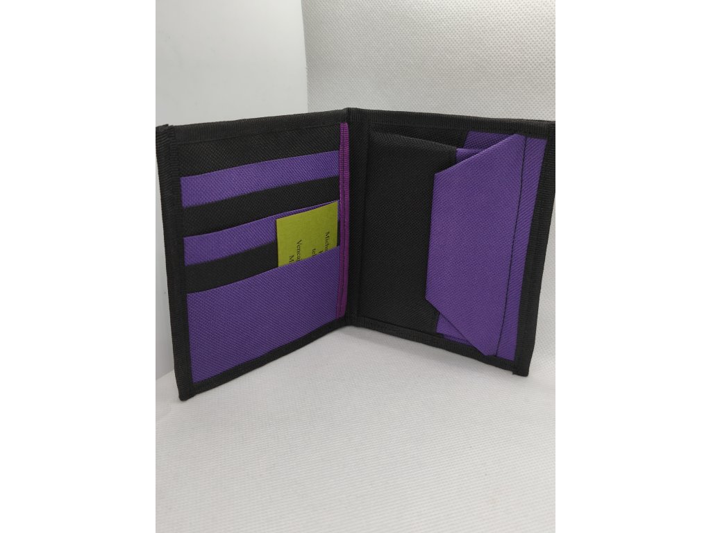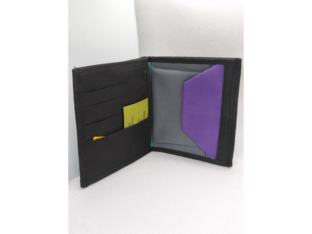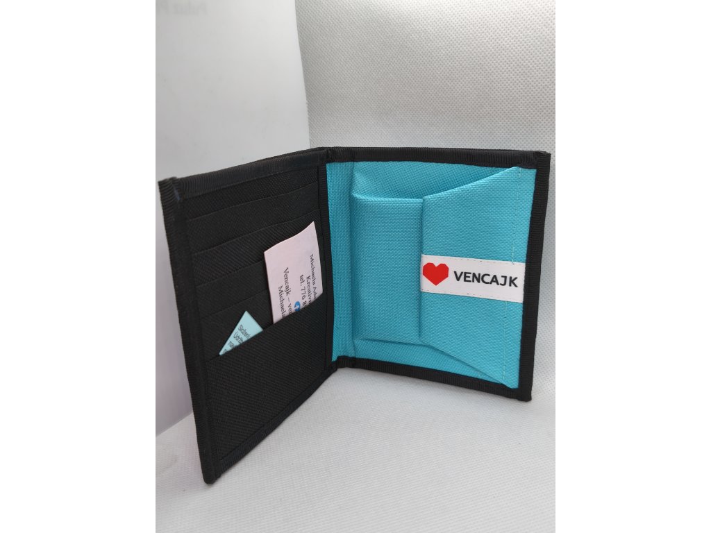 Tato peněženka je z odolného materiálu, který se dobře čistí (batohovina s polyuretanovým zátěrem) a je nepromokavá. Výhodou této peněženky je poměrně nízká váha a skladný tvar.