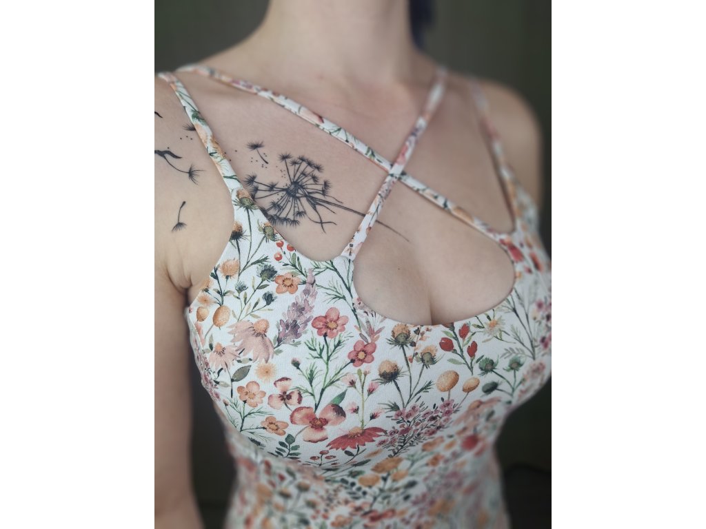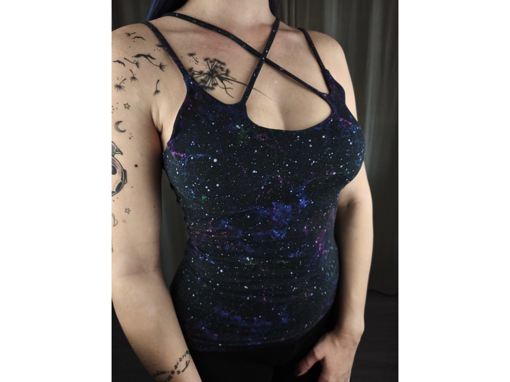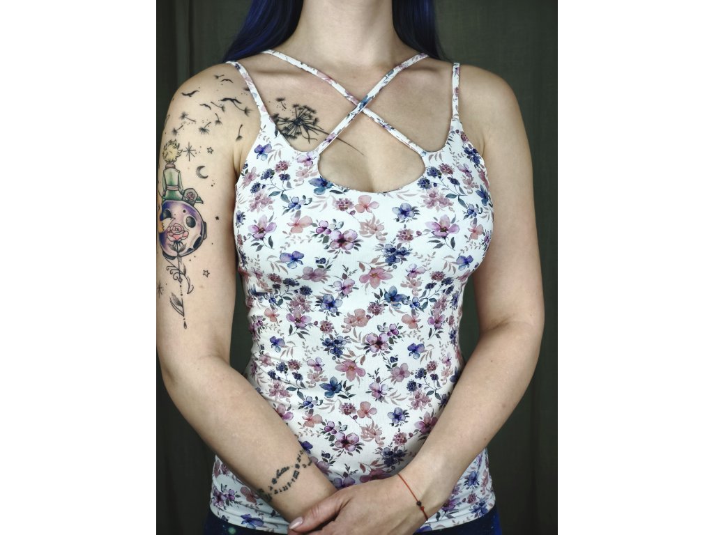 Toto tílko má dvě vrstvy na prsou a dá se nosit bez podprsenky. Spodní vrstva je prošitá, takže se ti to nebude rolovat pod prsama. Je to velmi pohodlné a praktické, vhodné pro vrstvení i jako spodní prádlo. Zajímavé řešení ve výstřihu s křížkem má pár výhod: