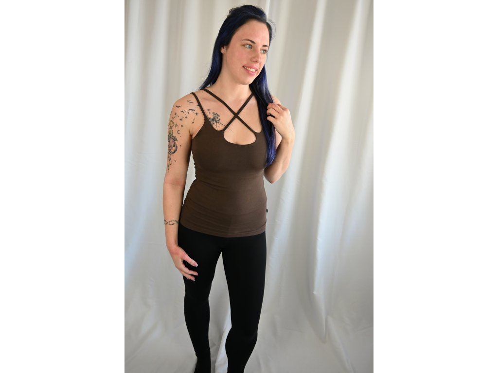Toto tílko má dvě vrstvy na prsou a dá se nosit bez podprsenky. Spodní vrstva je prošitá, takže se ti to nebude rolovat pod prsama. Je to velmi pohodlné a praktické, vhodné pro vrstvení i jako spodní prádlo. Zajímavé řešení ve výstřihu s křížkem má pár výhod: